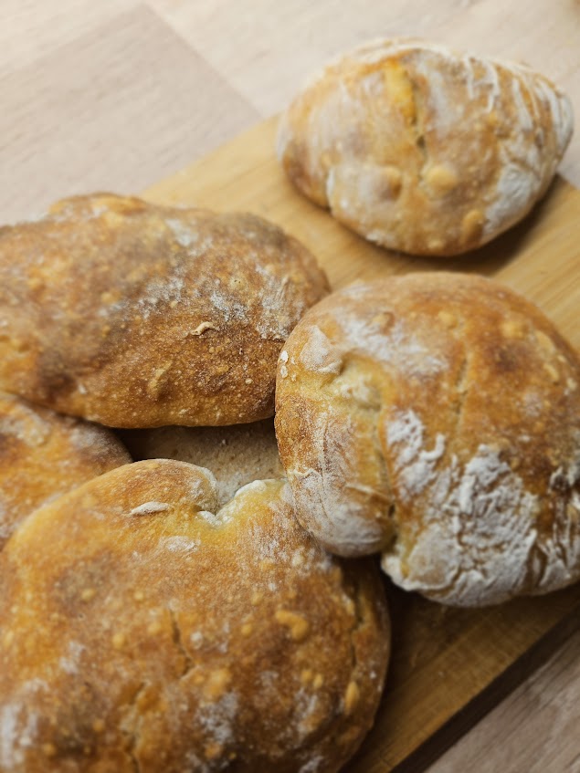 Ha deigen ut på en godt melet kjøkkenbenk, og del den i 8 like store stykker. Jobb så lite som mulig med deigen, og form de til firkantete former som mulig. legg de på et stekebrett og la de heve i ca 60 minutter. dekk til med et klede. Stek de midt i ovn på 225 gr. i 20 minutter. Avkjøles på rist.